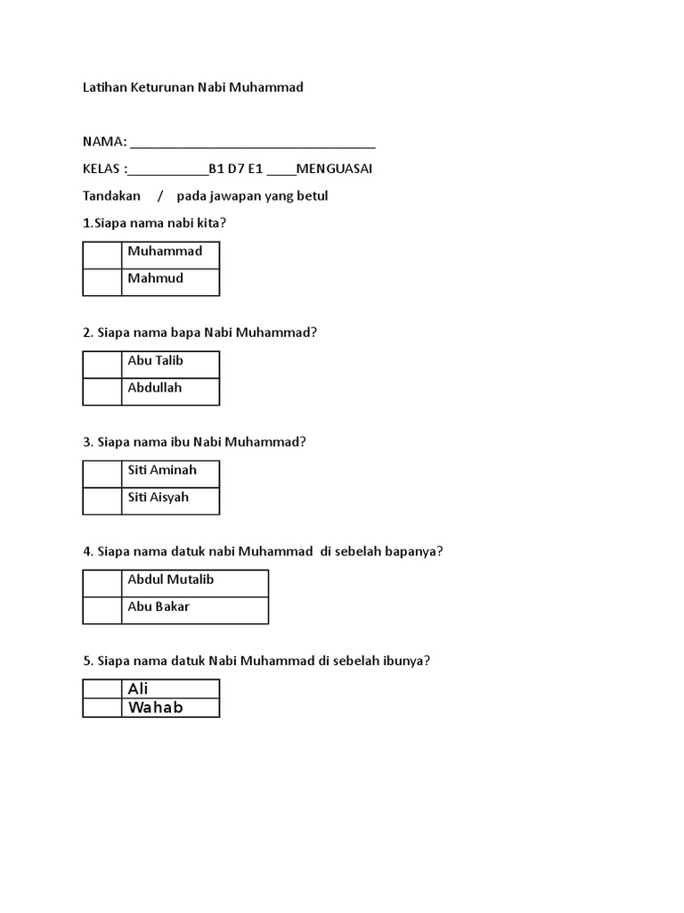 'abdullah bin 'abdul muttalib bin hashim. / suatu kaum yang termulia di makkah.nabi muhammad saw memiliki banyak sahabat, dan ada 10 nama sahabat nabi yang disebut sebagai al asyaratul al mubasysyaruna bil jannati. Siapakah nama ayah nabi muhammad saw preview this quiz on quizizz. Kenali keluarga nabi muhammad saw worksheet / nah, dari keluarga siapakah di mekah ini yang wajar dipilih untuk tugas kenabian? Nama kakek dari pihak ayah: